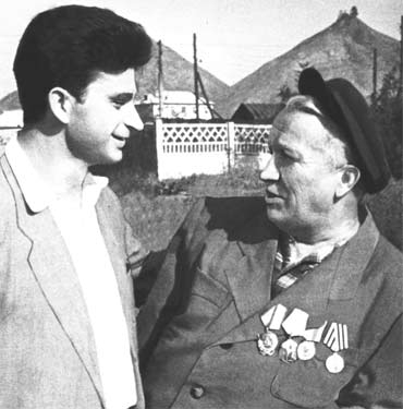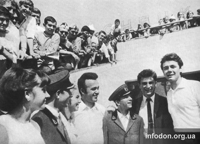 Юрий Гуляев (крайний справа), Анатолий Соловьяненко и Иосиф Кобзон среди горняков на праздновании Дня шахтера в Донецке. 1965 г.
