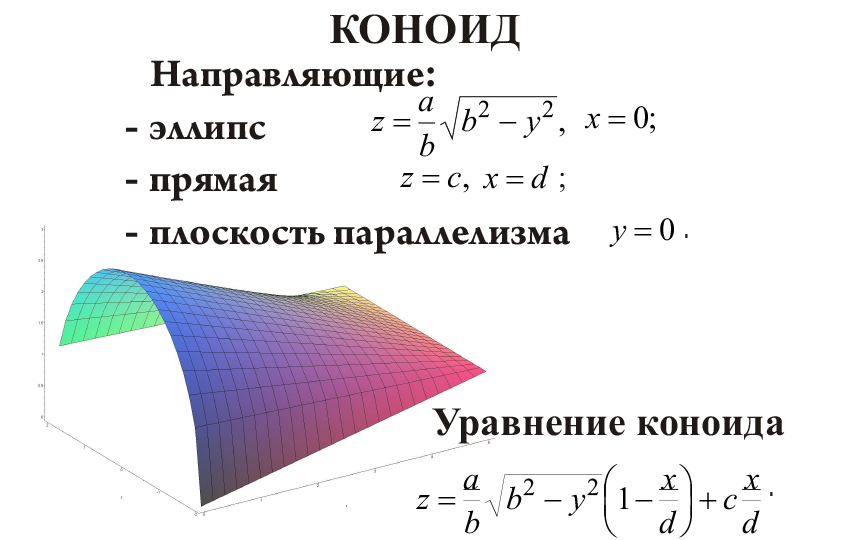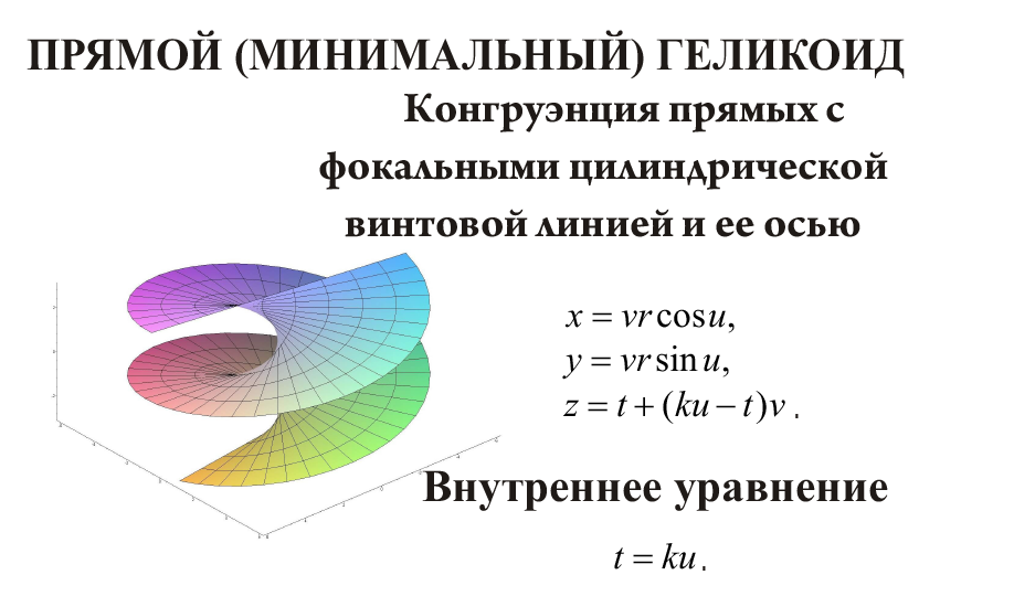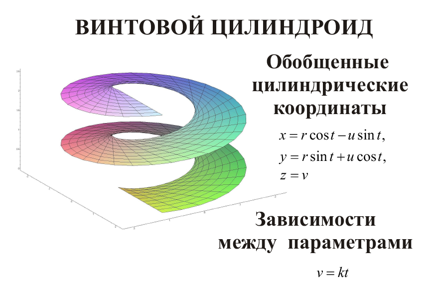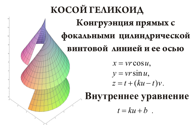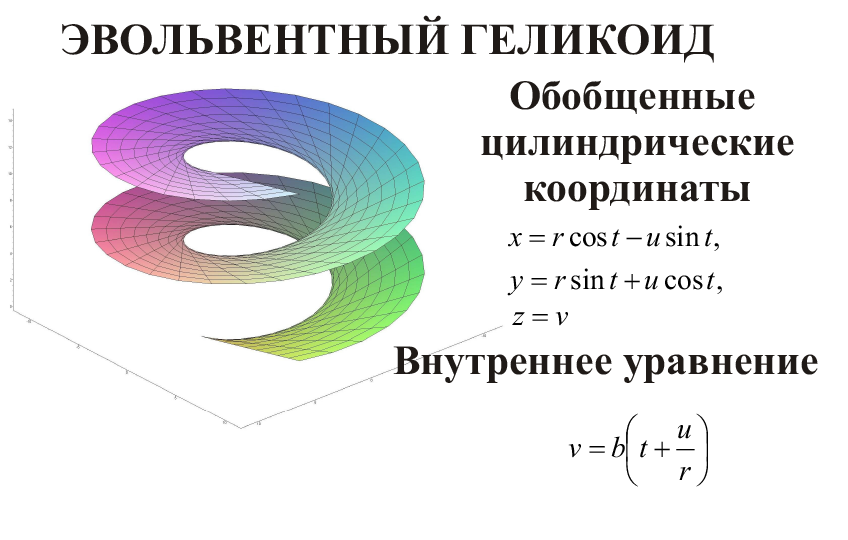 Спиральная поверхность. Поверхность этого класса образуется винтовым перемещением кривой , компонентами которого являются вращение вокруг оси и такое перемещение вдоль оси, которое обеспечивает преобразование подобия с центром на оси и коэффициентом подобия, пропорциональным углу поворота.