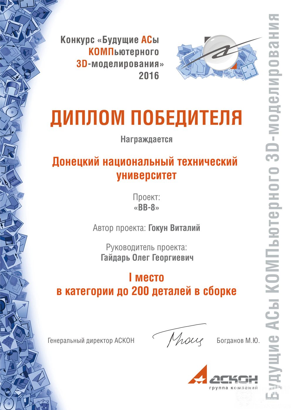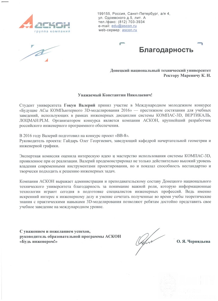 Вот уже 20 лет при кафедре существу сертифицированный учебный центр АО «АСКОН» по изучению графической системы КОМПАС-3D. За уровень подготовки наших студентов компания АСКОН выразила благодарность.